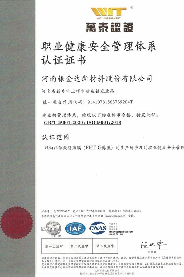 職業(yè)健康安全管理體系認(rèn)證證書(shū)