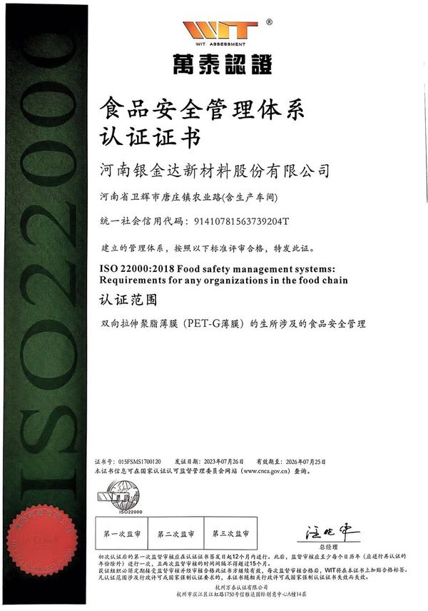 食品安全管理體系認(rèn)證證書(shū)