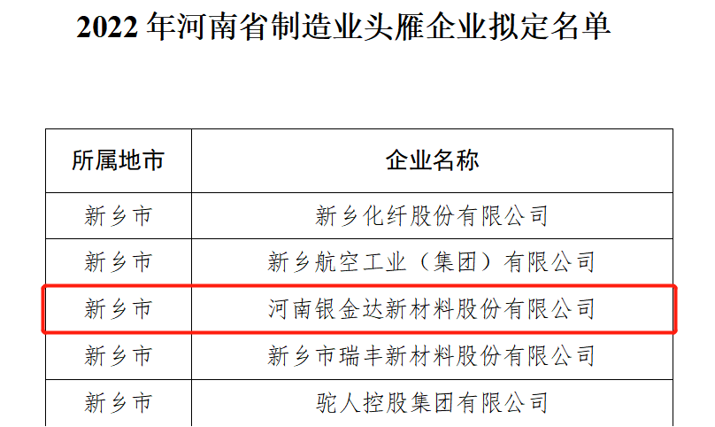 近日,省工信廳公示了2022年河南省制造業(yè)頭雁企業(yè)擬認(rèn)定名單,河南銀金達(dá)新材料股份有限公司順利入選。